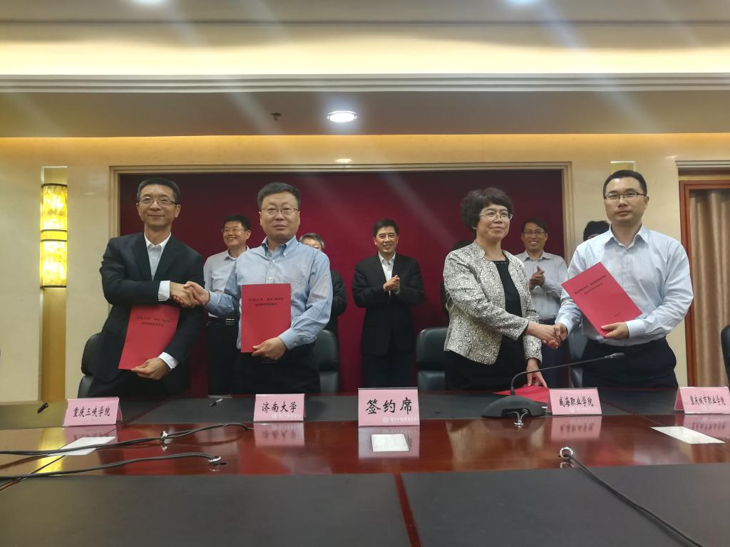 近日,我校与山东省济南大学在重庆市教委二楼会议室签署结对帮扶框架协议,期限为2019年6月至2021年6月,校长张伟与济南大学校长张士强在协议书上签字。重庆市委教育工委书记、教委主任舒立春,山东省委教育工委委员、教育厅副厅长王坦见证签约,副校长付川参加活动。